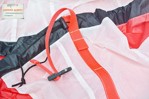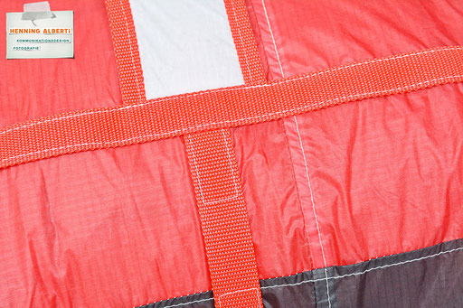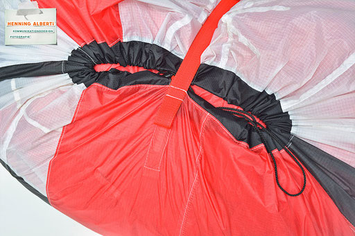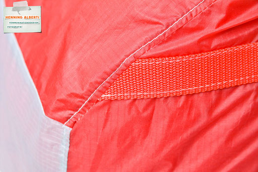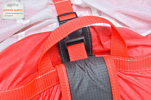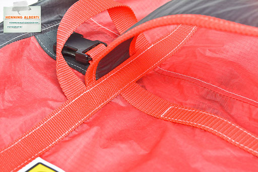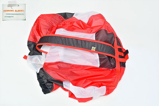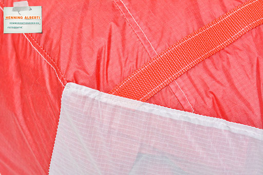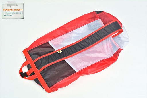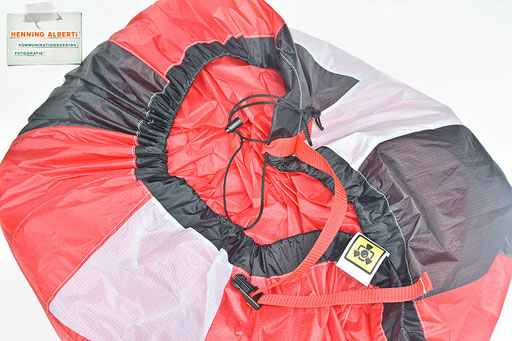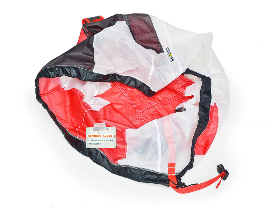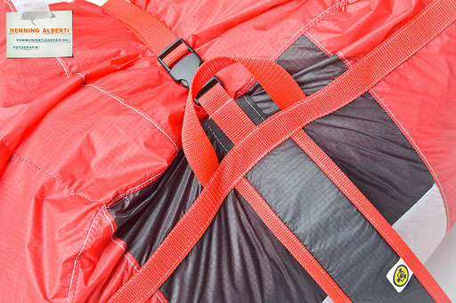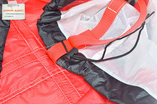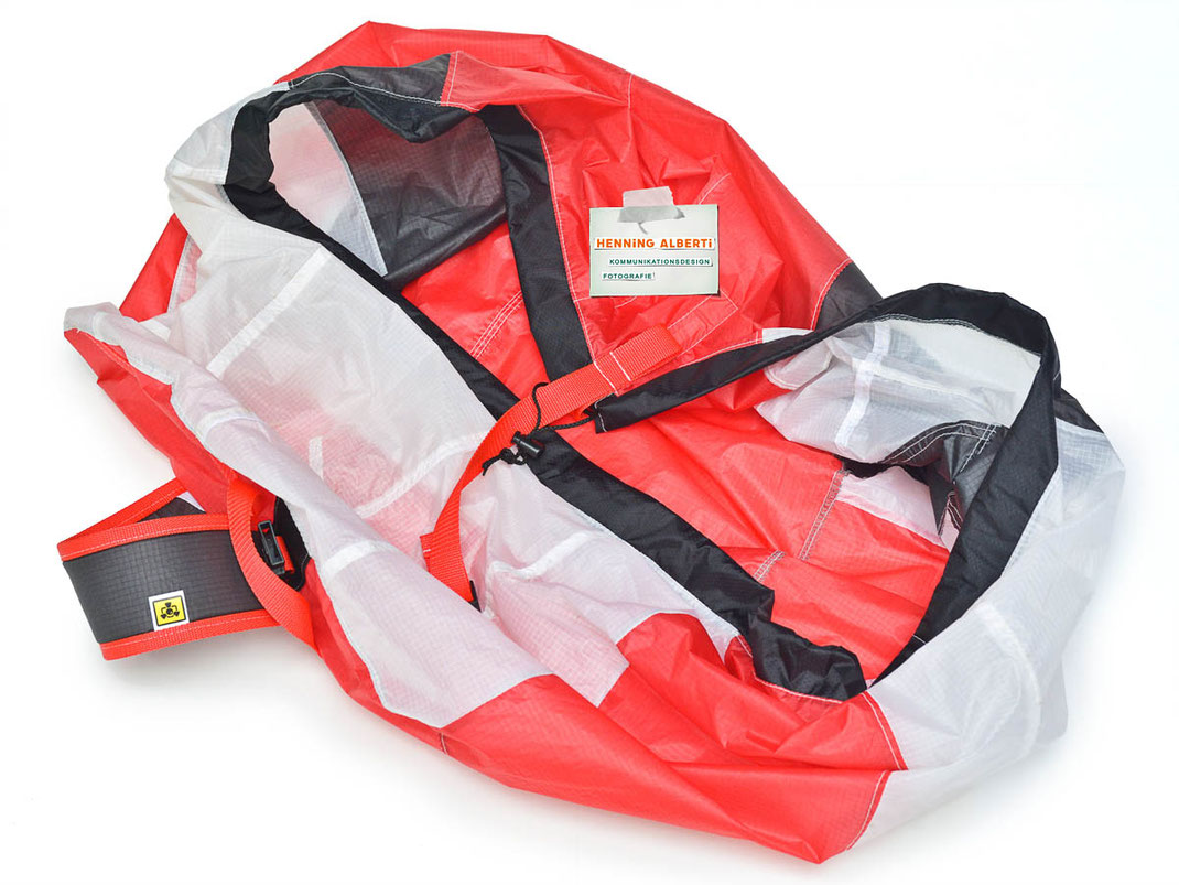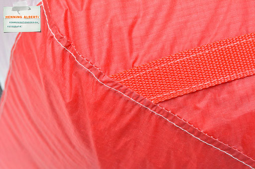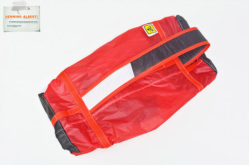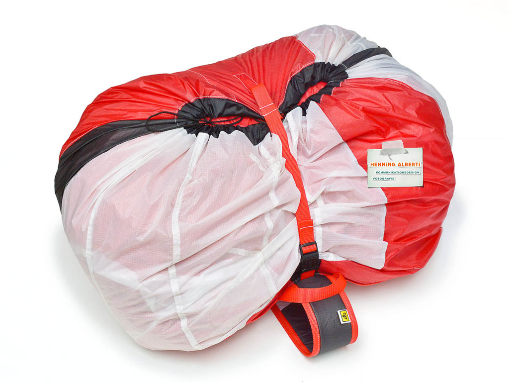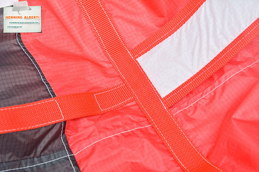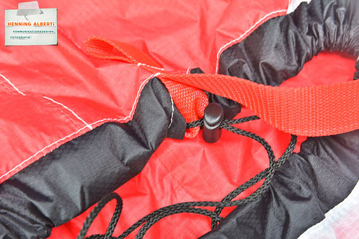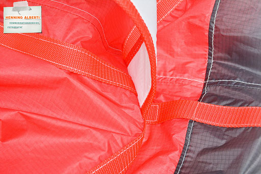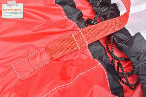 Bei allen Entwicklungsschritten diente ein Gleitschirm als Materialquelle für 35g-Ripstoptuch. Daher die schöne Vielfalt an Tuchpanels aus dem Gleitschirm und ein paar übernommene Details wie zum Beispiel Leinenaufhängungen. Fremd bzw. neu hinzugekommen ist die Polsterung für den Trageriemen und das rote Gurtband. Mit dem Gurtband und geschickter Nahtführung ist die Last vom Tragegurt und des Handgriffs auf die Gurtbänder verteilt, bevor sie reduziert und großflächig auf das Tuch gelenkt wird. Der Rafftunnel besteht aus 70g-Polyester-Ripstoptuch und ist für das Raffband am Ausgang mit dem roten Gurtband verstärkt. Auf Ösen habe ich bewusst verzichtet. Das schwarze Raffband wird mit einem Tanka gestoppt.
