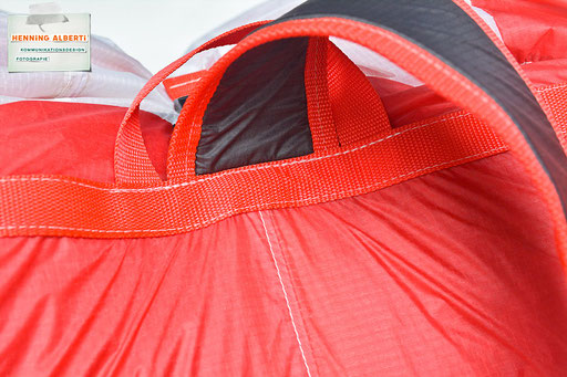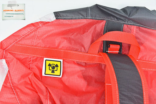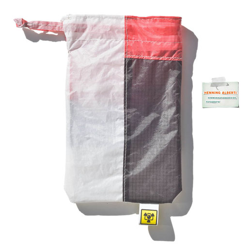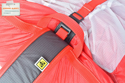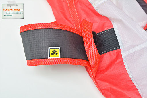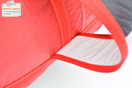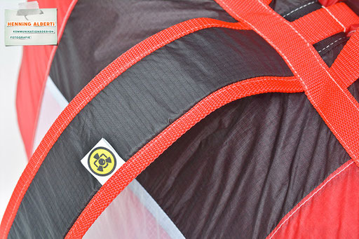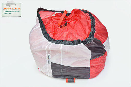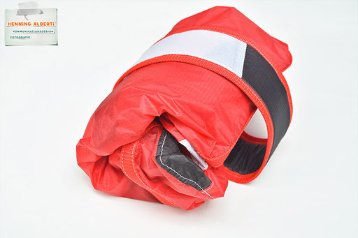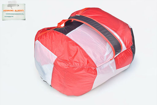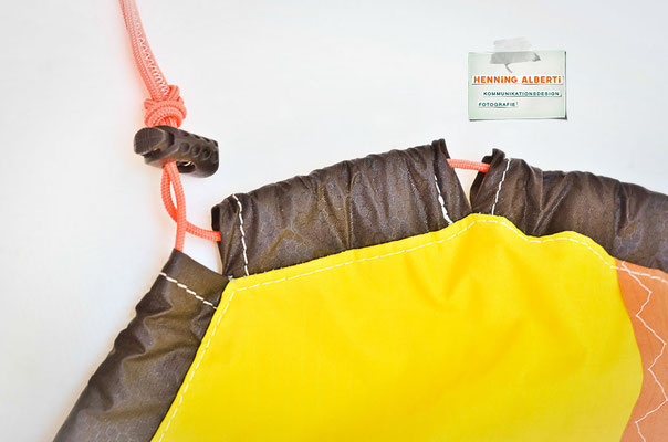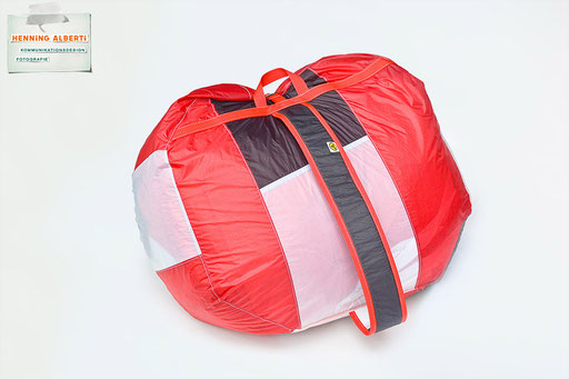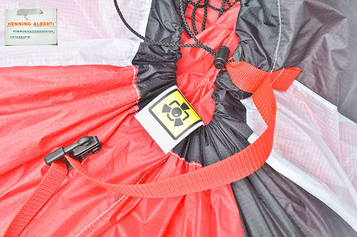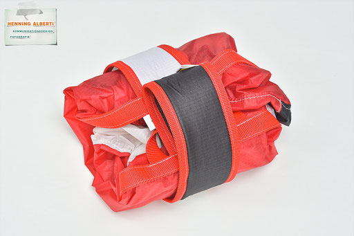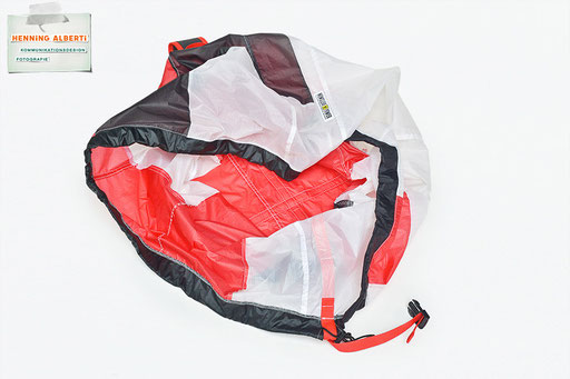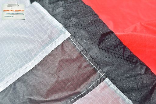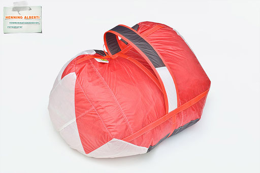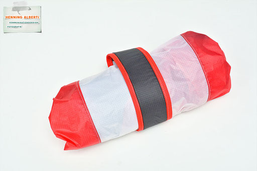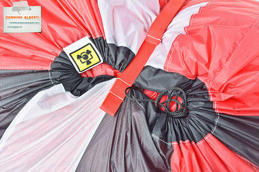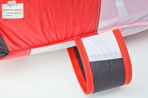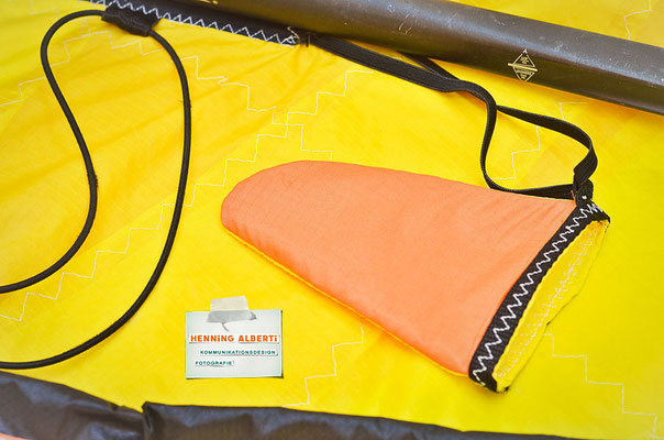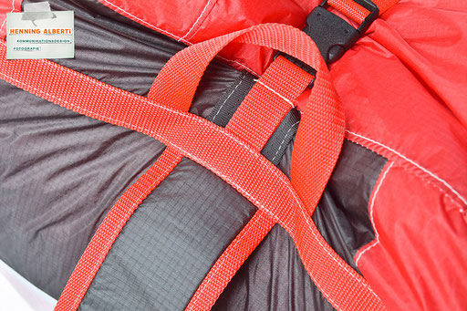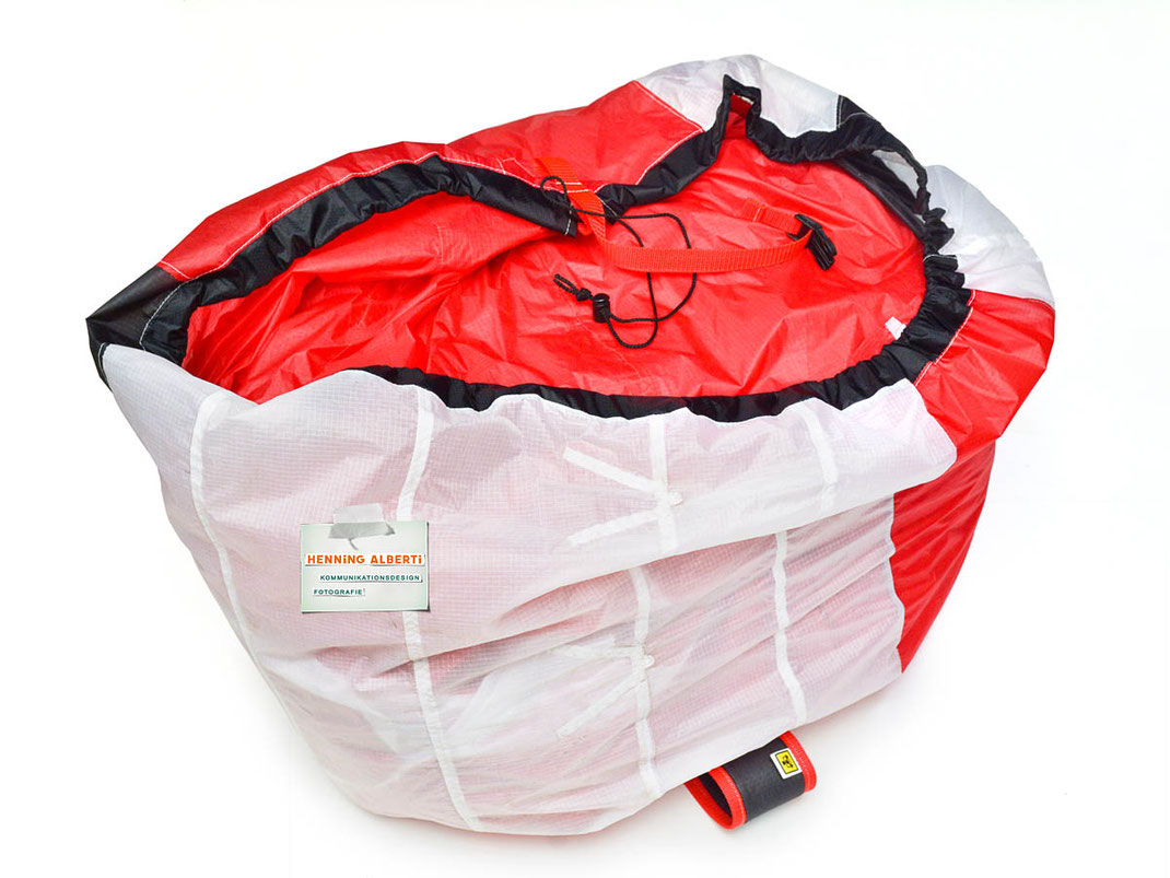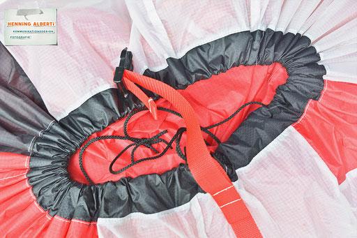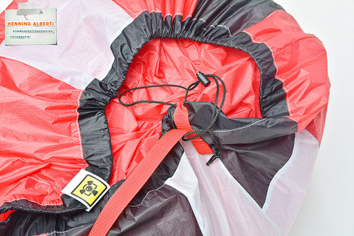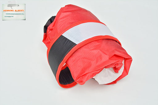 Bei allen Entwicklungsschritten diente ein Gleitschirm als Materialquelle für 35g-Ripstoptuch. Daher die schöne Vielfalt an Tuchpanels aus dem Gleitschirm und ein paar übernommene Details wie zum Beispiel Leinenaufhängungen. Fremd bzw. neu hinzugekommen ist die Polsterung für den Trageriemen und das rote Gurtband. Mit dem Gurtband und geschickter Nahtführung ist die Last vom Tragegurt und des Handgriffs auf die Gurtbänder verteilt, bevor sie reduziert und großflächig auf das Tuch gelenkt wird. Der Rafftunnel besteht aus 70g-Polyester-Ripstoptuch und ist für das Raffband am Ausgang mit dem roten Gurtband verstärkt. Auf Ösen habe ich bewusst verzichtet. Das schwarze Raffband wird mit einem Tanka gestoppt.