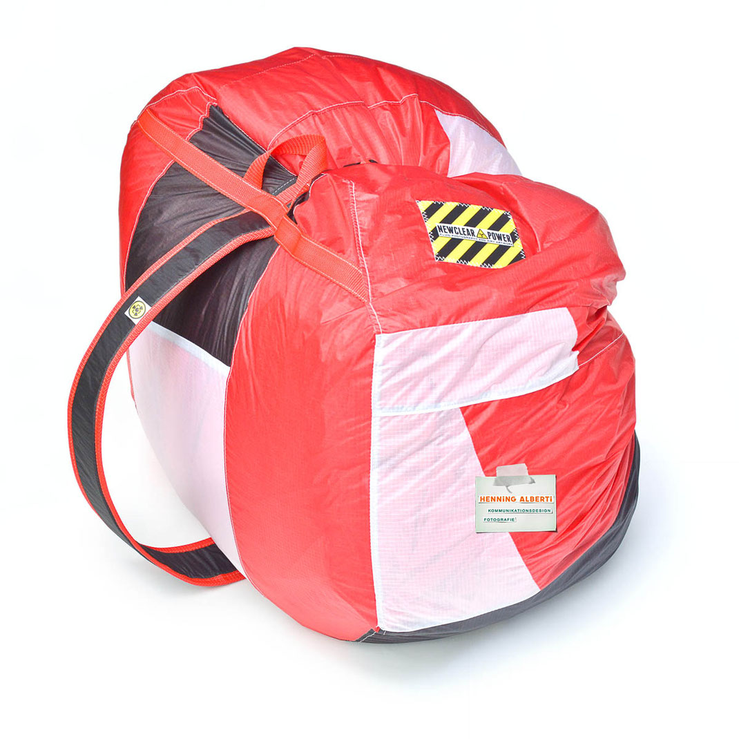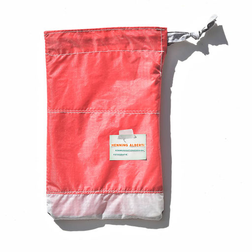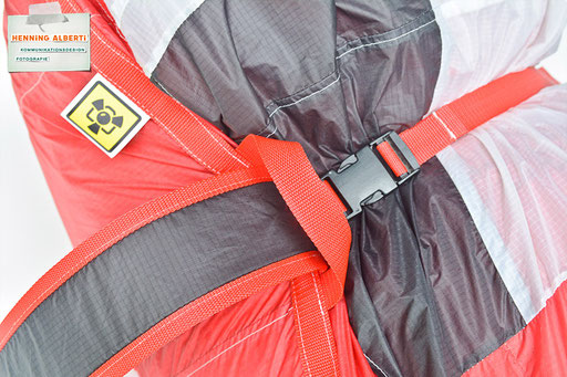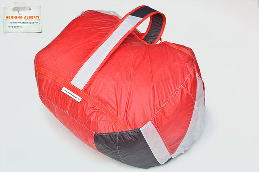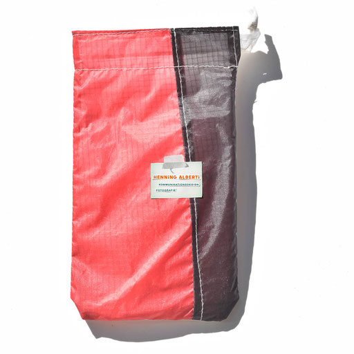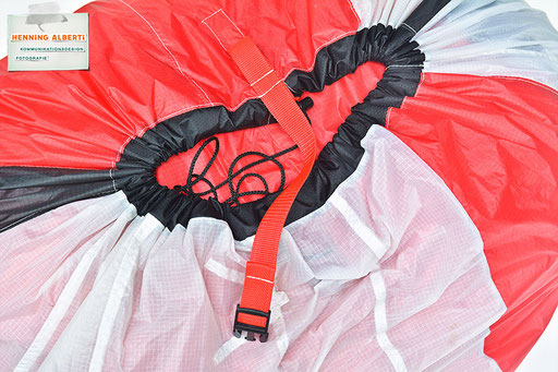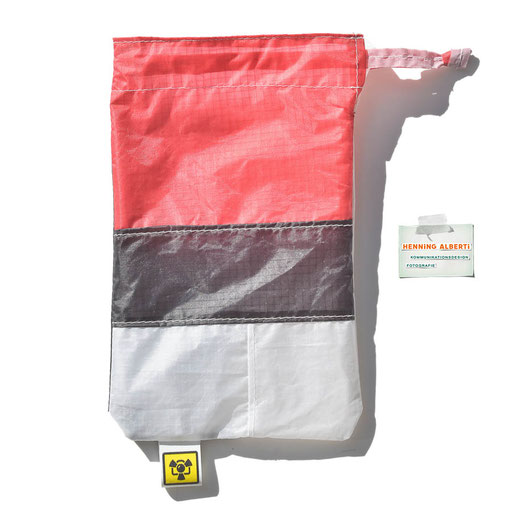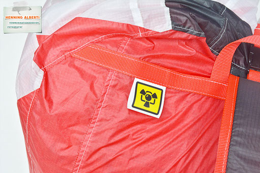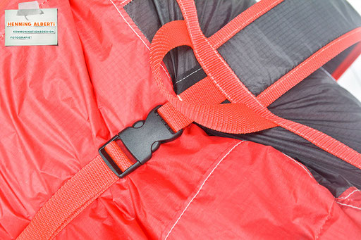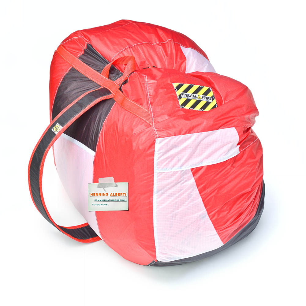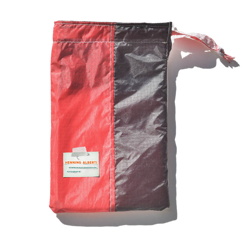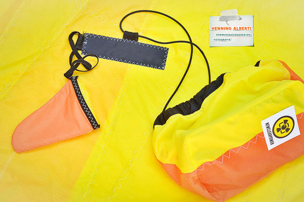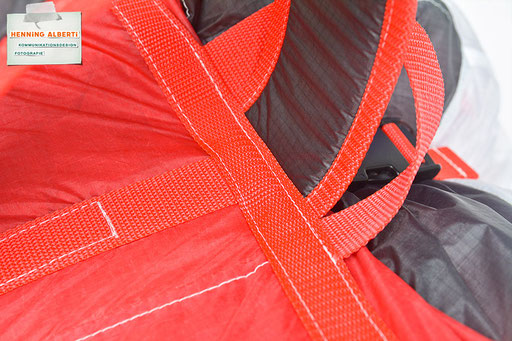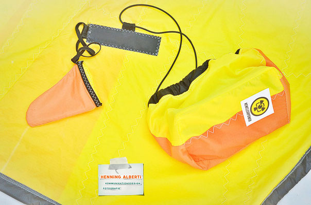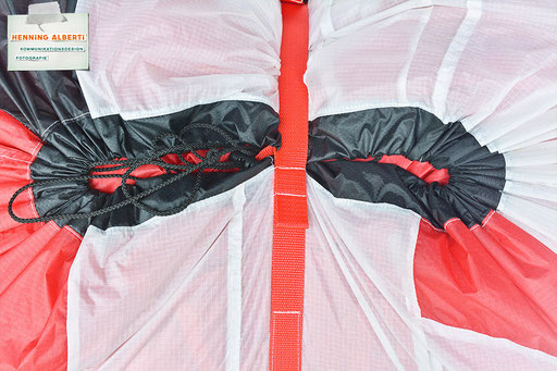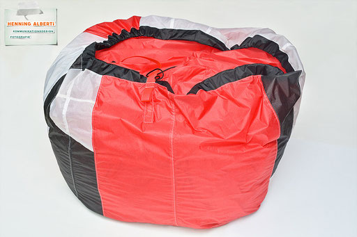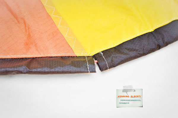 Bei allen Entwicklungsschritten diente ein Gleitschirm als Materialquelle für 35g-Ripstoptuch. Daher die schöne Vielfalt an Tuchpanels aus dem Gleitschirm und ein paar übernommene Details wie zum Beispiel Leinenaufhängungen. Fremd bzw. neu hinzugekommen ist die Polsterung für den Trageriemen und das rote Gurtband. Mit dem Gurtband und geschickter Nahtführung ist die Last vom Tragegurt und des Handgriffs auf die Gurtbänder verteilt, bevor sie reduziert und großflächig auf das Tuch gelenkt wird. Der Rafftunnel besteht aus 70g-Polyester-Ripstoptuch und ist für das Raffband am Ausgang mit dem roten Gurtband verstärkt. Auf Ösen habe ich bewusst verzichtet. Das schwarze Raffband wird mit einem Tanka gestoppt.