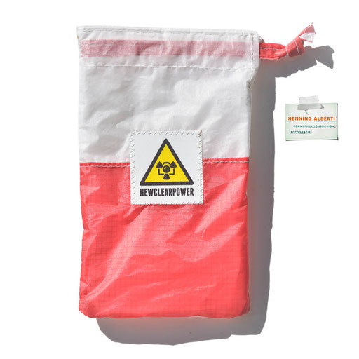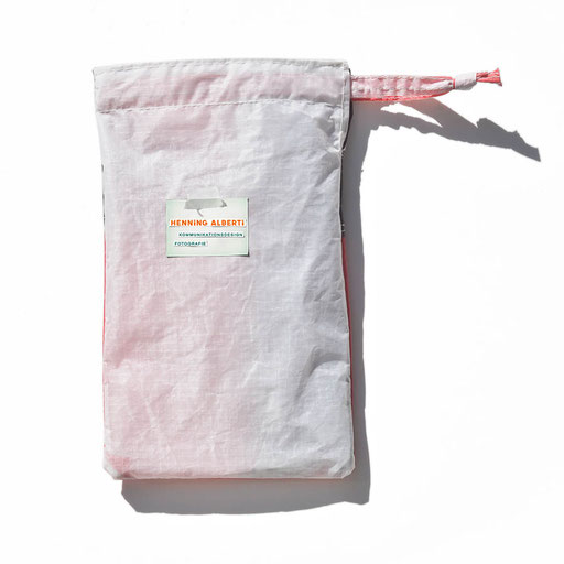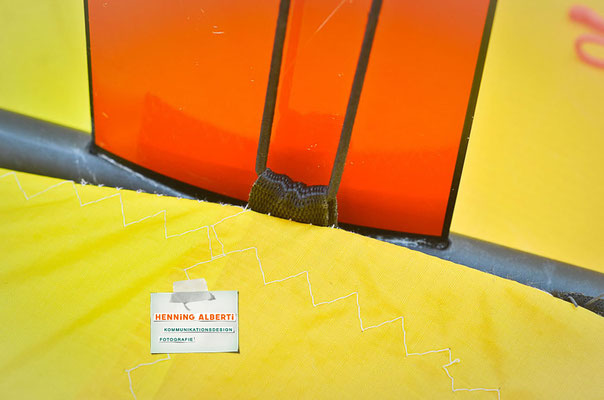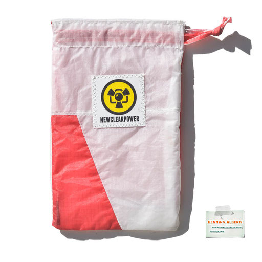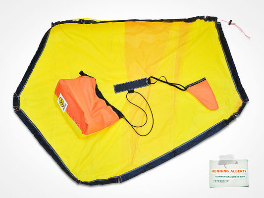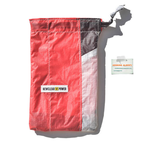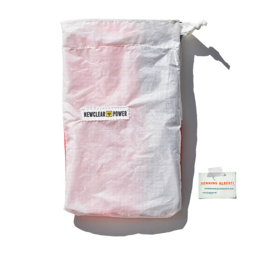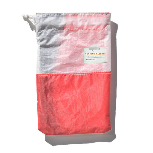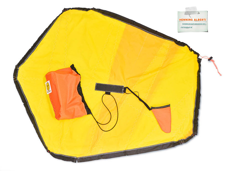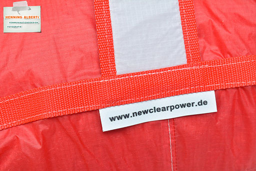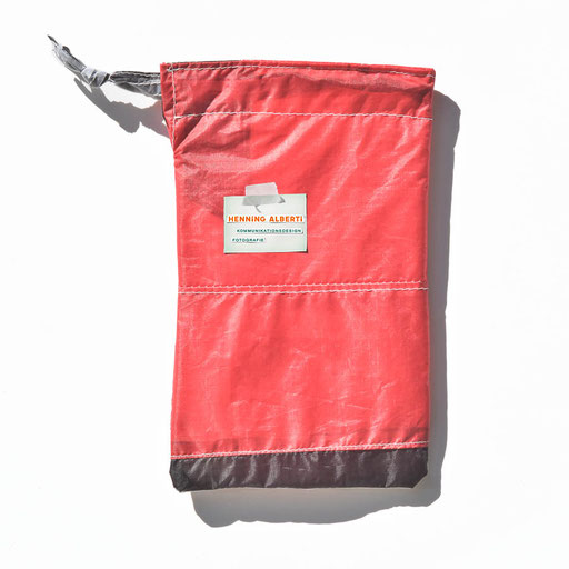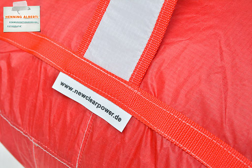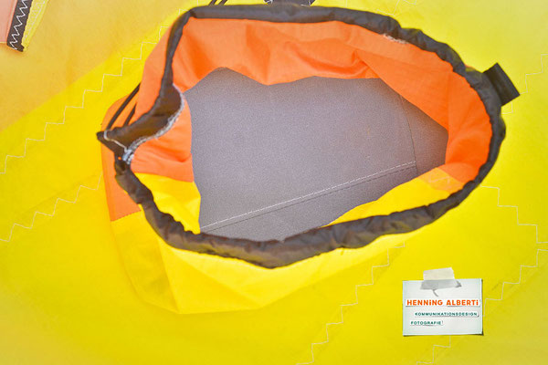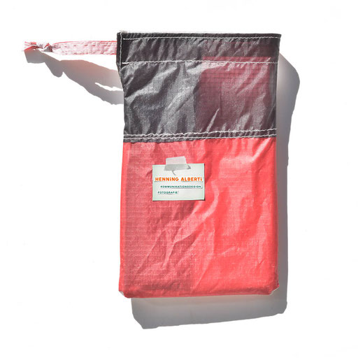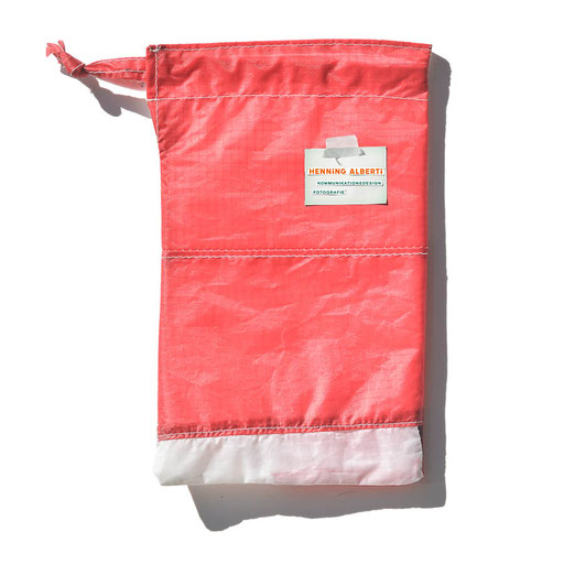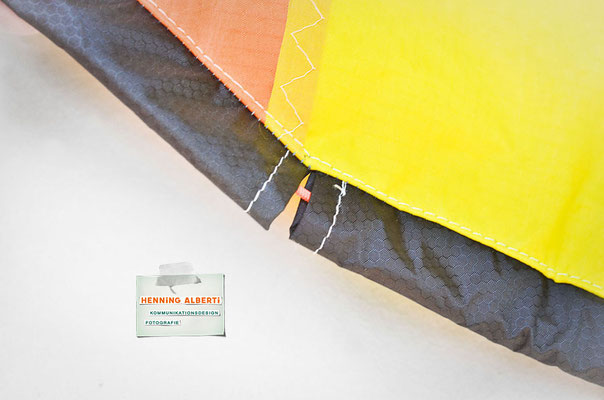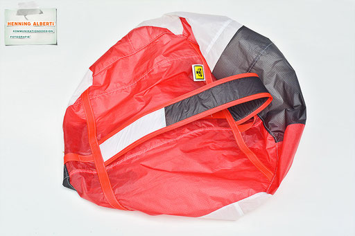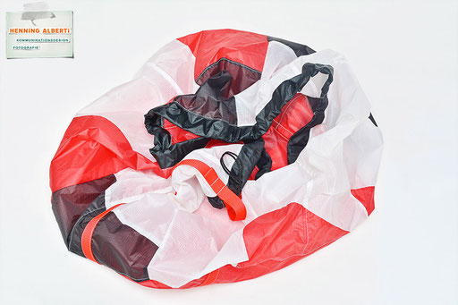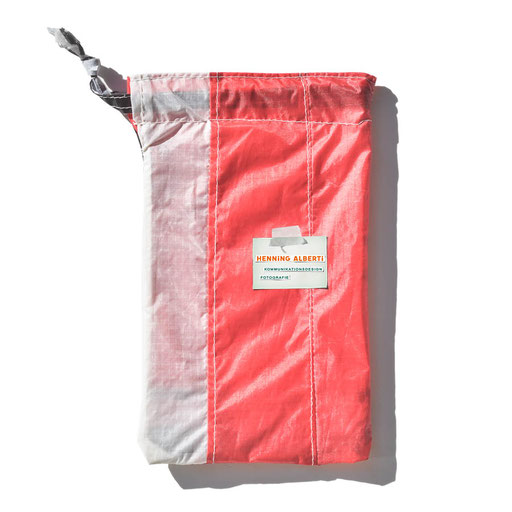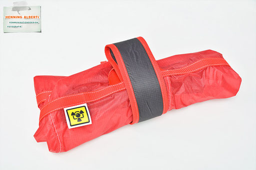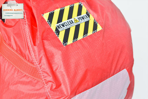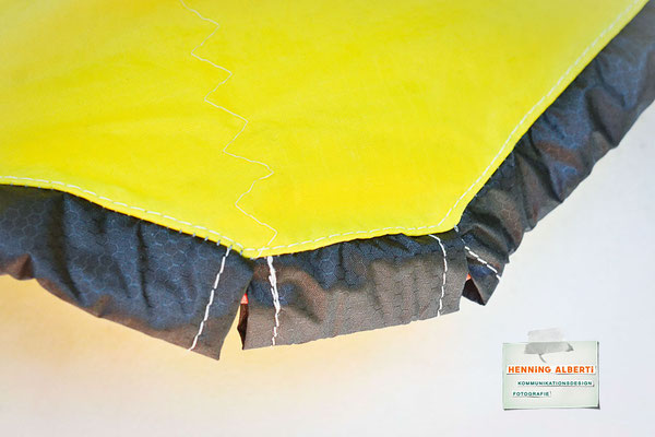 Bei allen Entwicklungsschritten diente ein Gleitschirm als Materialquelle für 35g-Ripstoptuch. Daher die schöne Vielfalt an Tuchpanels aus dem Gleitschirm und ein paar übernommene Details wie zum Beispiel Leinenaufhängungen. Fremd bzw. neu hinzugekommen ist die Polsterung für den Trageriemen und das rote Gurtband. Mit dem Gurtband und geschickter Nahtführung ist die Last vom Tragegurt und des Handgriffs auf die Gurtbänder verteilt, bevor sie reduziert und großflächig auf das Tuch gelenkt wird. Der Rafftunnel besteht aus 70g-Polyester-Ripstoptuch und ist für das Raffband am Ausgang mit dem roten Gurtband verstärkt. Auf Ösen habe ich bewusst verzichtet. Das schwarze Raffband wird mit einem Tanka gestoppt.