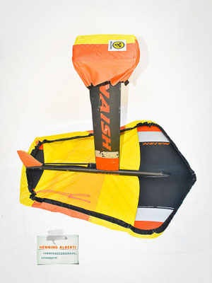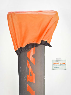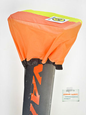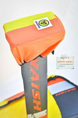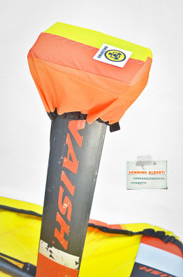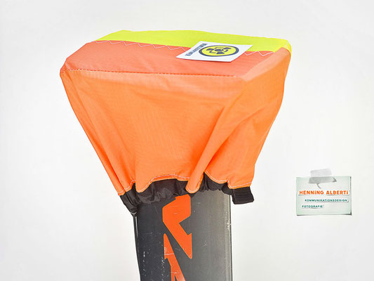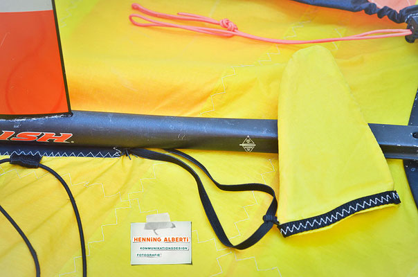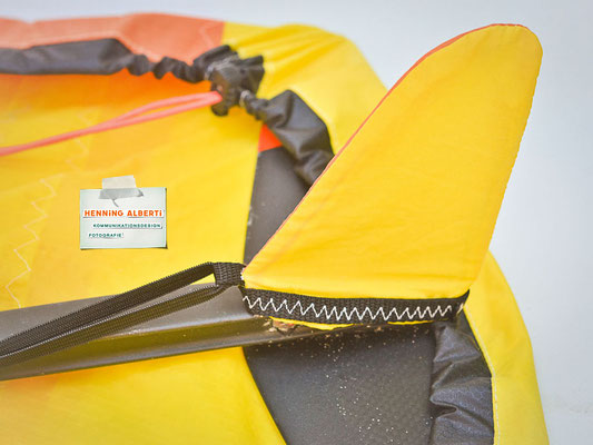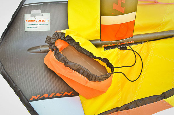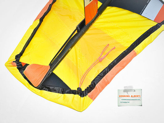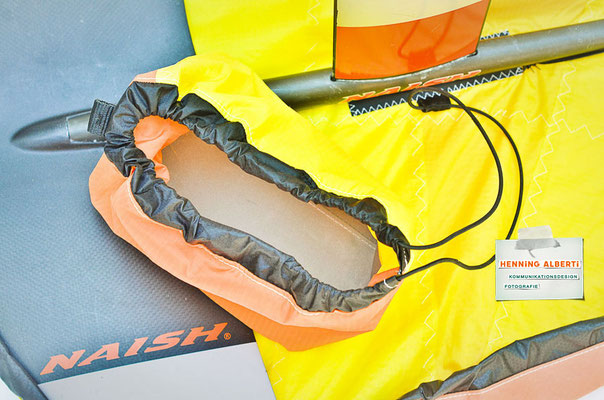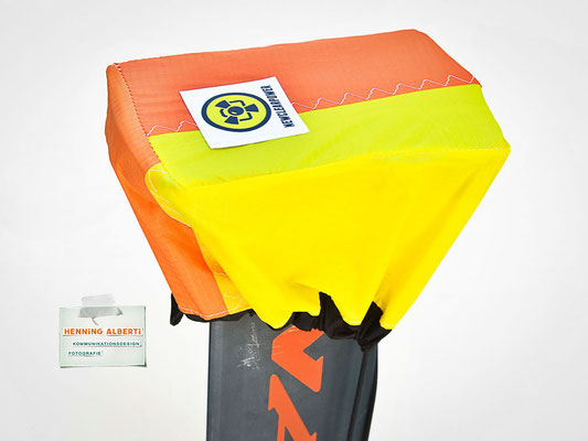 Das Gimmick an diesem Foilcover ist der Spannzug im schwarzen Tunnel rund um das Cover. So stellt man das Foil auf das offenliegende Cover und zieht an der Spannleine den Saum um die Außenkanten zusammen. Das wird mit dem Tanka gehalten. Dann gibt es zwei Gummizüge – der eine rafft die Kappe für die Foilaufnahme (scharfkantig!) im Tunnel zusammen, sobald man sie über die Aufnahme gestülpt hat. Dann gibt es noch ein Gummi zu einem Häubchen, mit dem man die vertikale Finne bzw. das Leitwerk vom Heckflügel schützt. Die Gummizüge halten Aufnahmeschutz und Finnenschutz sofort ab Überstülpung fest. Es sind insgesamt nur drei Handgriffe, mit denen das Foil verpackt ist!